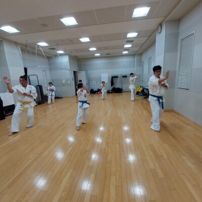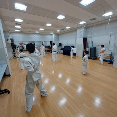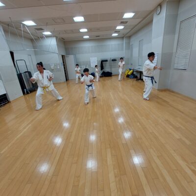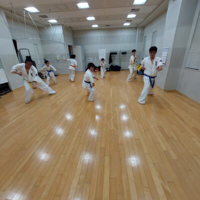 続いて、色帯事の移動稽古です。前屈立ちの追い突き。
