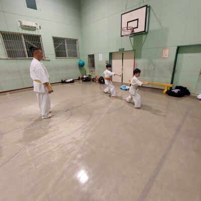 柔軟体操を行い、基本稽古は、まなび塾で行う形で抜粋して行いました!続いて型稽古です。白帯、太極その3 かなた君を前にして行います。