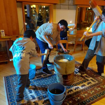 夕食も美味しくいただきました。食後のレクリエーション、餅つき楽しかったし美味しかったです。