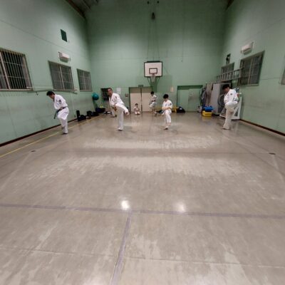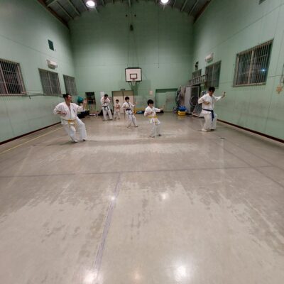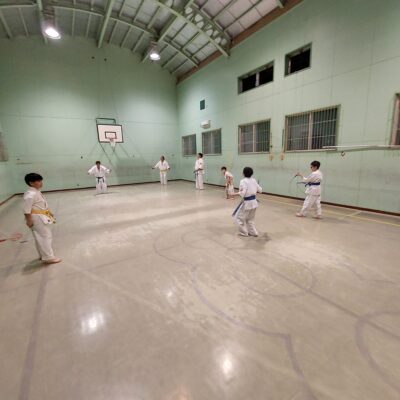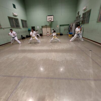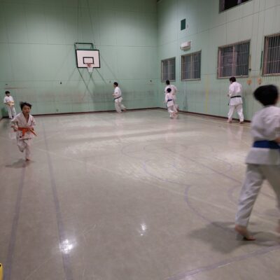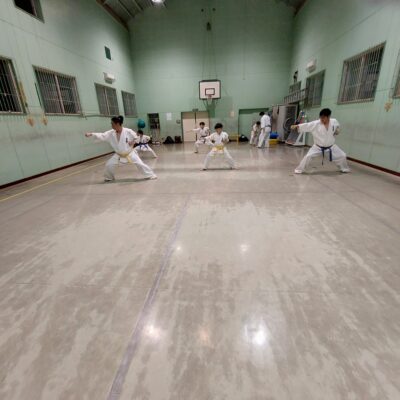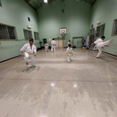 続いて移動稽古です。前屈立ち、後屈立ちの移動、前屈立ちの蹴り移動も行います。
