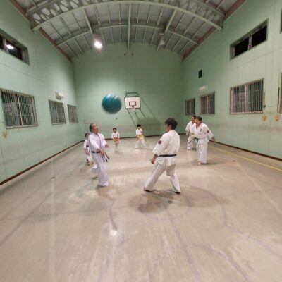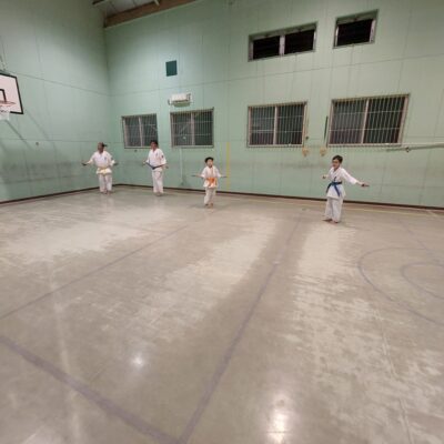 基本稽古を行い、次に前屈立ちの移動、後屈立ち、回転系、騎馬立ちの移動稽古を一通り行い。